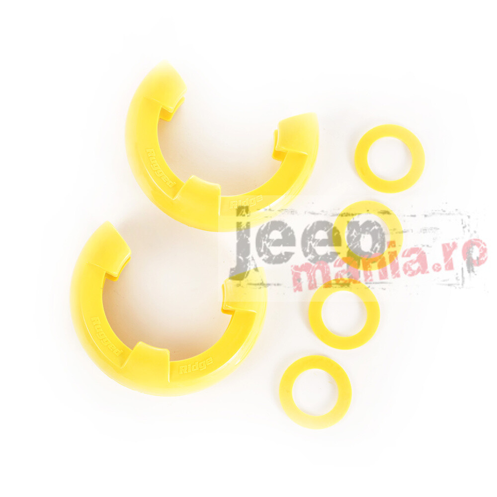This pair of yellow D-ring isolators from Rugged Ridge fits 7/8-inch rings and includes 2 rubber isolators and 4 washers.