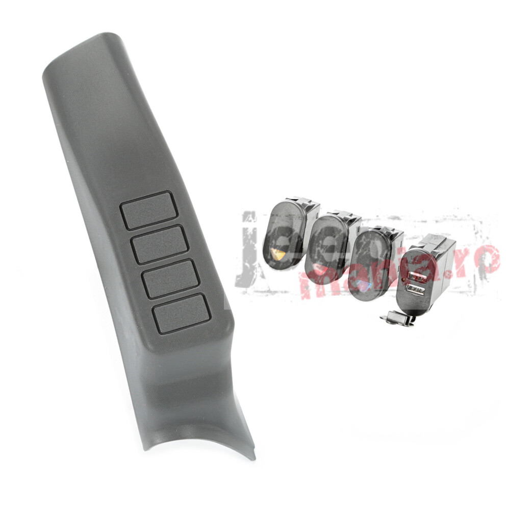 This 4 switch A-Pillar pod kit fits 07-10 Jeep Wrangler JK/JKU. It includes 3 marine style rocker switches, and a dual USB connector.