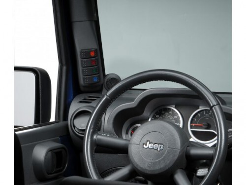 This dark charcoal A-pillar switch pod kit from Rugged Ridge fits the LHD A-pillar on 11-18 Jeep Wrangler. Includes four rocker switches.