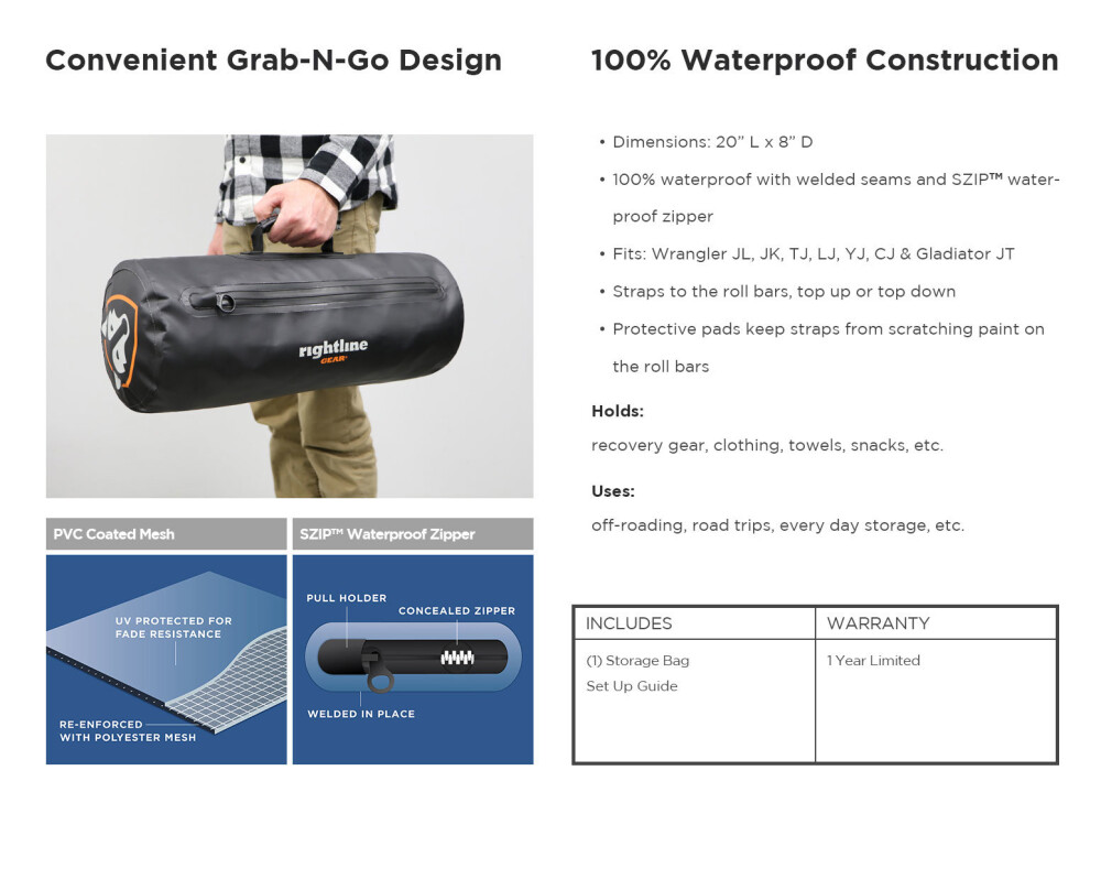 The weatherproof Jeep Storage Bags attach to the roll bars of your Jeep Wrangler to let you take advantage of every bit of storage space. Use the bags in any combination to hold all of the gear that you need. The bags work for you if you are trail-ready, holding gloves, tree trunk protectors, recovery straps, snatch blocks, first aid kits, jumper cables, tool kits, maps, bikini tops, and air compressors. The bags work for you if you are road-ready, holding jackets, extra clothing, hats, towels, blankets, sun screen, toiletry kits, and lunch/snacks. Keep the Storage Bags strapped in place or carry them outside of your Jeep like a duffle bag.