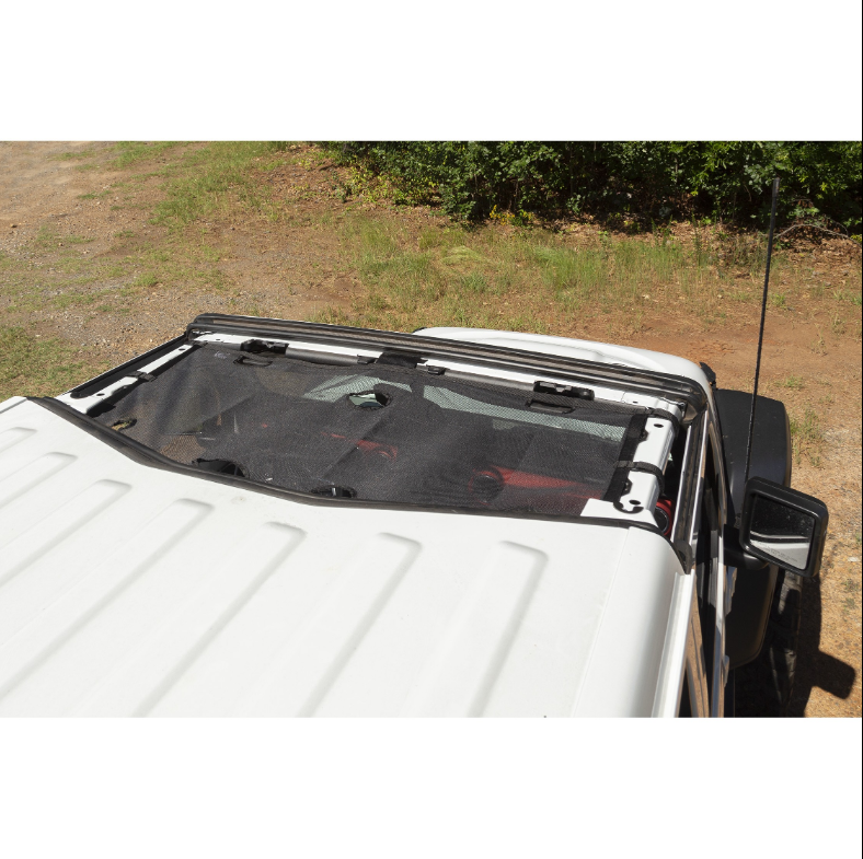 The Rugged Ridge Eclipse Sunshade gives the open air feeling you want, while providing added protection from harsh sunlight. Featuring reinforced mesh construction, the Eclipse Hard Top Sun Shade installs directly to the JL sports bar, helping protect front seat passengers from the sun’s harmful rays when the roof panels are removed. Unique mesh construction also serves to greatly reduce wind noise and buffeting, making a more enjoyable open-top driving experience. Integrated straps with hook & loop backing are easy to install and there’s no need to remove the shade to gain access to roof latches. The Eclipse Sun Shade can stay in place year round- making you fully prepared for that first sunny day. Retains factory use of freedom panels.