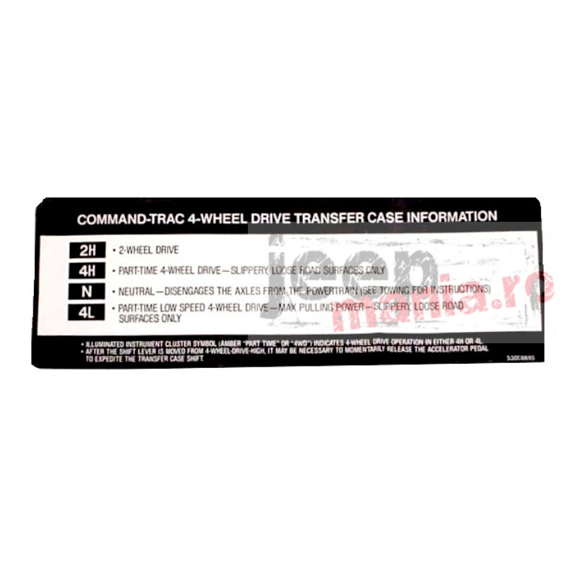 This reproduction transfer case sun visor decal from Omix-ADA fits 94-98 Jeep Cherokee and 97-98 Wrangler with a Command-Trac NP231 transfer case.